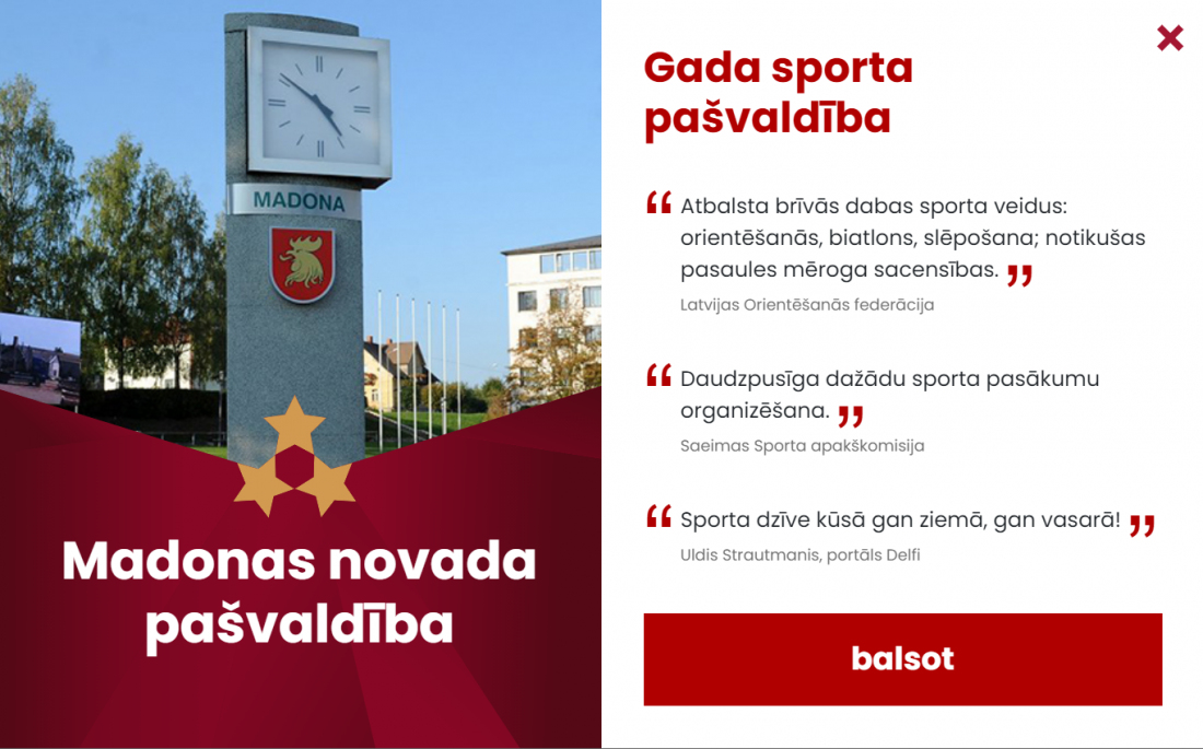 Nominēto vidū Madonas novada pašvaldība ("Gada sporta pašvaldība").