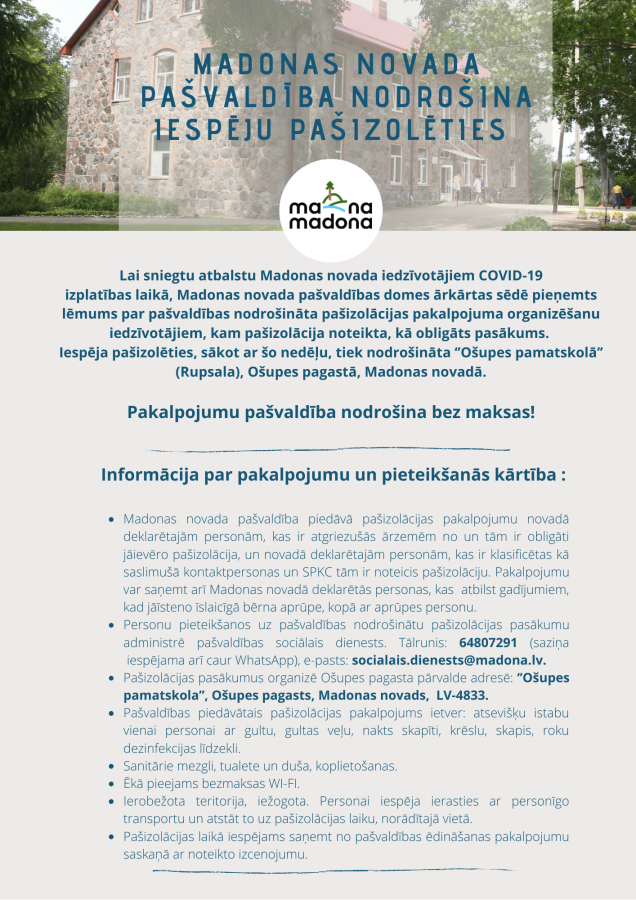2. Personu pieteikšanos uz pašvaldības nodrošinātu pašizolācijas pasākumu administrē pašvaldības sociālais dienests. Tālrunis: 64807291(saziņa iespējama arī caur WhatsApp), e-pasts: socialais.dienests@madona.lv