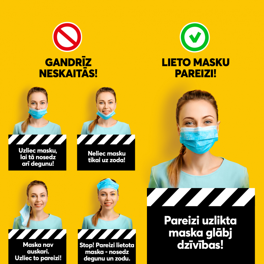 - Pareizi lietojot sejas masku (tai jānosedz gan deguns, gan zods). Lai pasargātu sevi un citus no saslimšanas ar Covid-19, turpmāk sejas vairogu drīksti lietot tikai tad, ja uzvilkta ir arī sejas maska.