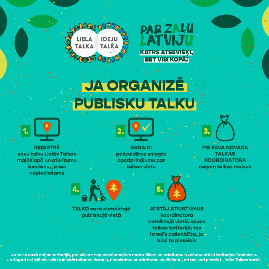 Ikvienam interesantam joprojām ir iespēja pieteikt savu SOLO talku, Lielo Talku vai zināmas piesārņotās vietas Lielās Talkas mājaslapā www.talkas.lv sadaļā “Kartes”. Bet pats galvenais - rūpējies par savas zemes tīrību, sakoptību un drošību arī ikdienā, vienmēr!