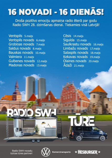 Maija mēnesī Radio SWH jeb tautā dēvētais “Oranžais rādžiņš” nolēmis savus svētkus svinēt, ar unikālo radio mobilo studiju apceļojot Latviju un iepazīstot Latvijas novadu sniegtās iespējas, skaisto dabu un pats svarīgākais – satiktu savus klausītājus.