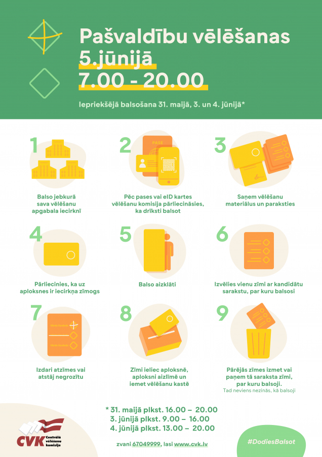 Vēlēšanu iecirkņu darba laiks pašvaldību vēlēšanu dienā, 5.jūnijā, būs no pulksten 7.00 līdz 20.00. Vēlētāji varēs izmantot arī iespēju nobalsot iepriekš: