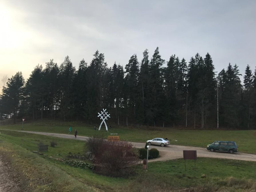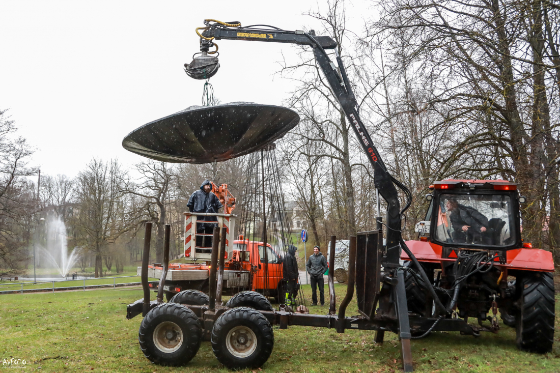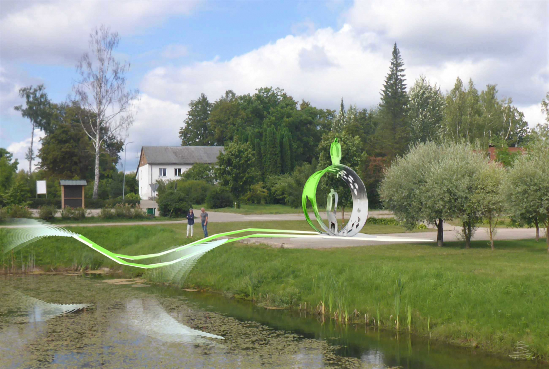 Kinētiska skulptūra – vides objekts “Mētrienas laika rats”. Tās autors Ģirts Burvis un tās izmērs augstumā 4,5 - 5m.