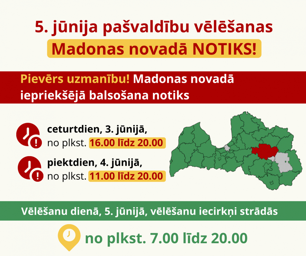 Saeima otrdien, 1. jūnijā, pieņēma grozījumus Administratīvo teritoriju un apdzīvoto vietu likumā, no kuriem izriet, ka Madonas novads tiek saglabāts esošajās robežās, un 5. jūnija domes vēlēšanas notiks arī šajā vēlēšanu apgabalā. Vienlaikus Madonas novada domes vēlēšanās ir noteikts atšķirīgs iepriekšējās balsošanas laiks, tas būs 3. jūnijā no plkst.16.00 līdz 20.00, bet 4. jūnijā no plkst. 11.00 līdz 20.00.