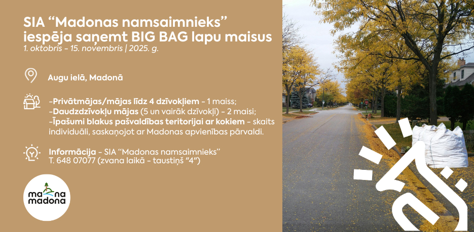 Iedzīvotāji lapu maisu var saņemt Augu ielā 29, Madonā, SIA "Madonas namsaimnieks" darba laikā: