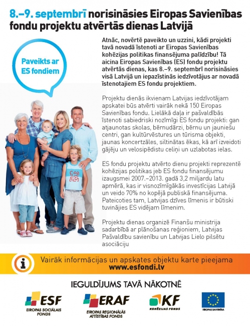 Atnāc, novērtē paveikto un uzzini, kādi projekti tavā novadā īstenoti ar Eiropas Savienības kohēzijas politikas finansējuma palīdzību! Tā aicina Eiropas Savienības (ES) fondu projektu atvērtās dienas, kas 8. un 9. septembrī norisināsies visā Latvijā un iepazīstinās iedzīvotājus ar apkārtnē īstenotiem ES fondu projektiem.