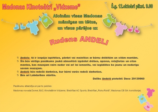 Madonas un apkārtnes māmiņas un tēti tiek aicināti piedalīties bērnu lietoto preču ANDELĒ, kas notiks Madonā kinoteātra „Vidzeme” telpās. Pasākuma laikā varēs pārdot, mainīties, iepirkties, tiks organizētas radošās darbnīcas bērniem. Pieteikties pie organizatores Daces Dzilnas – tel. 29139960. Pasākuma organizēšanu atbalsta arī citas aktīvas Madonas novada māmiņas.