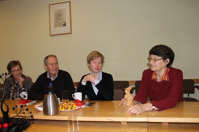 Vācu mākslinieks Stefans Vogts ar kundzi ir ieradušies Madonā, lai atklātu savu koktēlniecības skulptūru izstādi Madonas muzejā. Kopā ar mākslinieku ieradusies arī Vaijes pašvaldības kultūras darba organizatore Tīna Fišere. Tikšanās brīdī piedalījās arī deputāte, Kalnagravu tautas nama direktore Valda Kļaviņa, kā arī muzeja direktore Līvija Zepa un vēsturniece Dace Zvirgzdiņa.