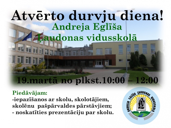 Š.g.19.martā no plkst.10:00 - 12:00 skolas vadība laipni aicina Jūs un Jūsu vecākus uz Atvērto durvju dienas pasākumiem.