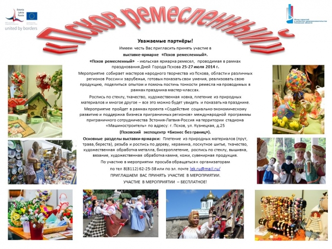 Projekta “Sociāli ekonomiskās attīstības, biznesa un sadarbības veicināšana pierobežas reģionos” ietvaros izstādei Pleskavā var pieteikties arī mūsu amatnieki līdz 9.jūlijam elektroniski janina@madona.lv vai pa telefonu 29421255.