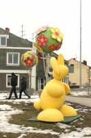 Savukārt ideja par Lieldienu zaķiem nākusi no mākslinieka Imanta Spridzāna. Ideja tika izlolota jau tālajā 1994.gadā, kad radās pirmās skices ar zaķīti, kuram visas detaļas veidotas olas formā. Virpoti koka zaķīši (7-10cm augsti) ap 1000-1500 eksemplāros savulaik sūtīti uz Somiju. Māksliniekam vienmēr ir bijusi vēlme zaķi izgatavot daudz lielākā formā un viņš ir gandarīts, ka to izdevies realizēt tieši Madonā.