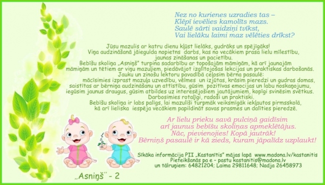 Bēbīšu skoliņa "Asniņš" turpina darbību. Gaidītie topošie un esošie vecāki.