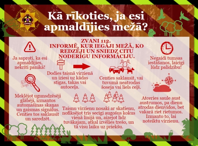 Ja saprotat, ka pašu spēkiem nespēsiet izkļūt no meža, zvaniet glābējiem pa tālruni 112 un nosauciet tiem pēc iespējas konkrētākus orientierus – kurā vietā Jūs iegājāt mežā, cik ilgi esat uzturējies mežā, kādus dabas vai cilvēka veidotus objektus Jūs esat šķērsojis vai tiem pagājis garām. Atcerieties, ka jebkurš sīkums var palīdzēt glābējiem Jūs atrast!