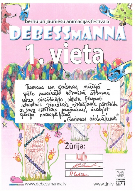 Kategorijā Grupas darbs skolotāju vadībā , par animācijas filmu “Gaismas Aicinājums” iegūta 1. vieta, diplomā žūrijas komisija raksta: “Tumsas un gaismas mūžīgā spēle muzikāli ritmiskā ātrumā virza piesātināto sižetu. Eleganti atrastais vizuālais risinājums pārsteidz ar savu estētisko paņēmienu, ieraujot spēcīgā noskaņā filmā”. Filmiņu ar J. Simsona dzejas vārdiem var noskatīties šeit: https://www.youtube.com/watch?v=A-AIw6DBC4k