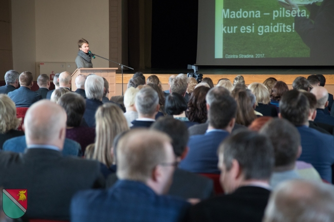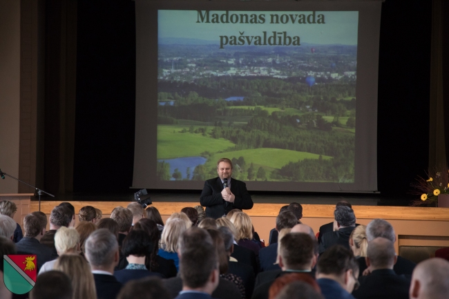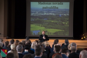Sanāksmes gaitā izpildvaru vadītāji uzklausīja Madonas novada domes priekšsēdētāja Andreja Ceļapītera un izpilddirektora Āra Vilšķērsta uzrunas, prezentācija par novadu. |
