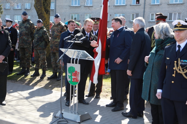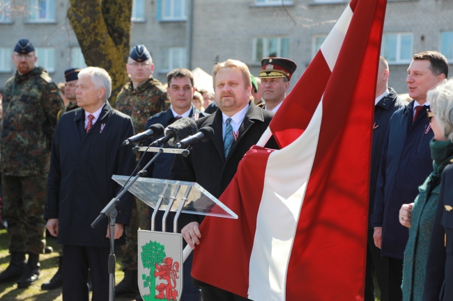 Foto redzama Madonas novada pašvaldības dalība "Brīvības svētkos" Liepājā, kuru laikā Liepājas pilsētas mērs nodod Latvijas karogu Madonas novada pašvaldības priekšsēdētājam.