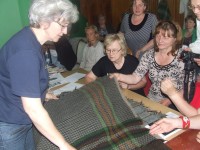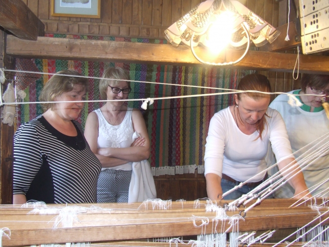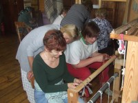 dalībnieces un vadītāja Aija Krūmiņa apgūst prasmes – aušanu uz Pētera