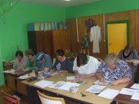 Sarkaņu aušanas pulciņa 12 dalībnieces apgūst desinatūru.