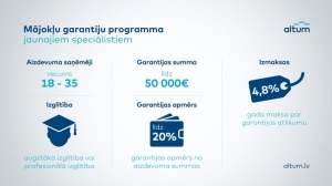 Reinis Bērziņš, Altum valdes priekšsēdētājs: “Programmas līdzšinējā norise apliecina, ka tā labi palīdz risināt aktuālo pirmās iemaksas uzkrāšanas problēmu. Ņemot vērā iedzīvotāju interesi un konsultācijas ar komercbankām, prognozējam, ka garantijas būs pieprasītas arī jauno speciālistu vidū un tuvāko trīs gadu laikā piešķirsim garantijas aptuveni 3300 jaunajiem speciālistiem ar kopējo garantiju apjomu 23 miljoni eiro. Programmas darbības mehānisms ir saņēmējiem maksimāli ērts, jo valsts atbalstu faktiski var saņemt dažu dienu laikā savā bankā. Personām, kas vēlas iegādāties mājokli, jādodas uz banku, banka izvērtē pēc hipotekārā aizdevuma pieteikumu un, ja nepieciešams, vēršas Altum pēc galvojuma.”