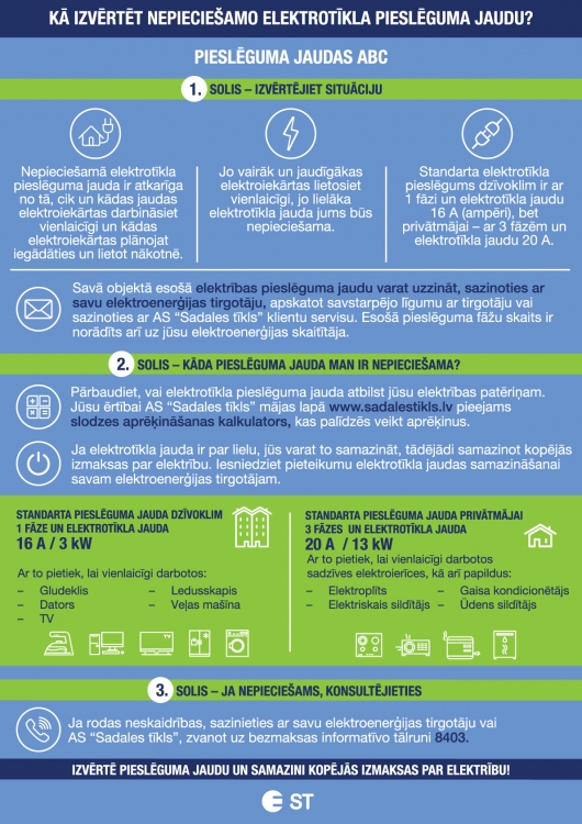 Nepieciešamā elektrotīkla pieslēguma jauda ir atkarīga no tā, cik un kādas jaudas elektroiekārtas tiek darbinātas vienlaicīgi un kādas elektroiekārtas plānots iegādāties un lietot nākotnē. Jo vairāk un jaudīgākas elektroiekārtas tiek lietotas vienlaicīgi, jo lielāka elektrotīkla jauda ir nepieciešama. Visbiežāk klienti, aprēķinot nepieciešamo pieslēguma jaudu savam īpašumam, kļūdās, skaitot visu darbināmo elektroierīču jaudu kopā, tomēr jāņem vērā, ka elektrotīkla pieslēguma jauda ir tā jauda, kuru jūs varat darbināt vienlaicīgi un visbiežāk tie ir tikai 20% no visām elektroierīcēm. Tas jāņem vērā gan mājsaimniecībām, gan uzņēmumiem. Kā papildrīku nepieciešamās jaudas aprēķināšanai var izmantot AS “Sadales tīkls” mājas lapā www.sadalestikls.lv pieejamo Slodzes aprēķināšanas kalkulatoru, kas palīdzēs veikt aprēķinus. Nereti jau vēsturiski pieslēgumam ir pieprasīts elektrotīkla pieslēgums ar jaudas rezervi, bet faktiski tā netiek izmantota, jo ikmēneša maksājums agrāk nebija saistīts ar pieprasītās jaudas apjomu, bet gan norēķini notika pēc faktiski patērētā elektrības daudzuma. Mainot sadales pakalpojumu tarifu struktūru, kā arī ieviešot obligātā iepirkuma jaudas komponenti, situācija ir mainījusies.
