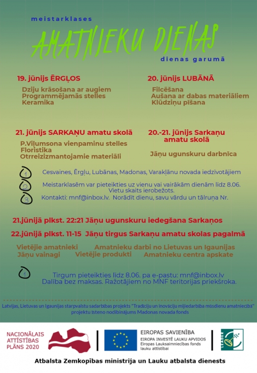 Skaistajā pirmssvētku laikā Madonas novada Sarkaņos pie Amatu skolas interesenti tiek aicināti iesaistīties dažādās aktivitātēs: praktiskās rokdarbu meistarklasēs, kopīgā Saulgriežu ugunskura iedegšanā un svētku labumu sarūpēšanā Jāņu dienas tirdziņā.