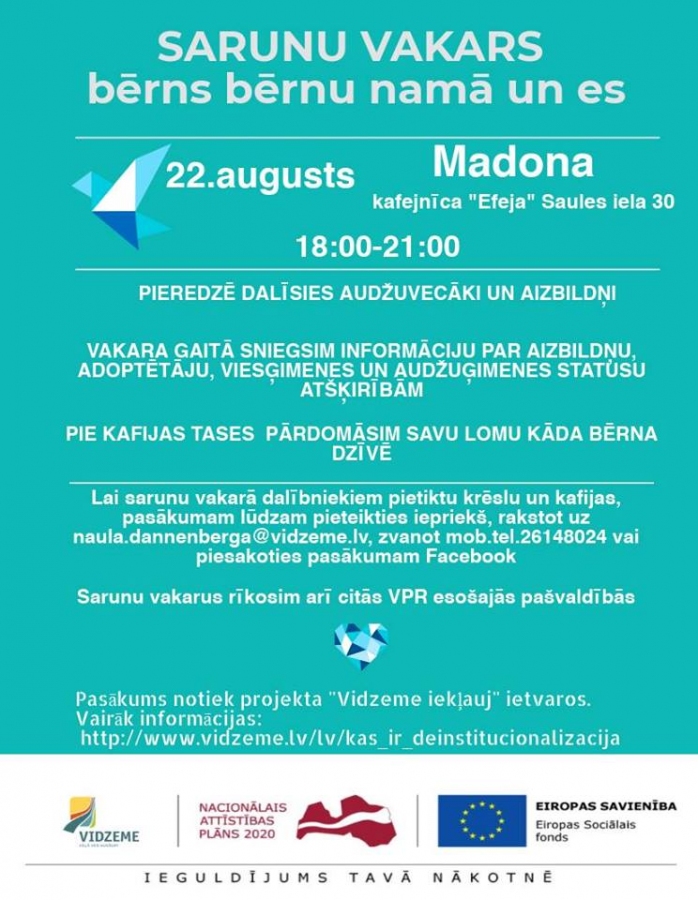 Vidzemes plānošanas reģions, projekta “Vidzeme iekļauj” ietvaros rīkos sarunu vakarus neformālā atmosfērā ikvienam interesentam, kurš kādreiz ir domājis par bērnu bērnu namā.