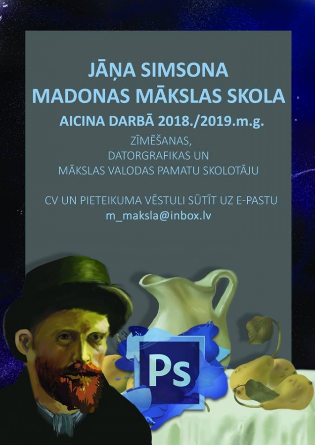 J. Simsona Madonas Mākslas skola aicina darbā skolotāju darbā ar sagatavošanas grupām un 1. kursu trīs dienas nedēļā no plkst. 13.00 - 17.35.