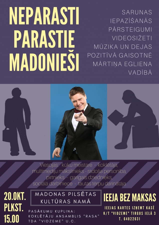 Aicinām - 20.oktobrī plkst.15.00. Madonas pilsētas kultūras namā. Ieeja bezmaksas. Ieejas bezmaksas kartes lūdzam iegādāties kasē kinoteātrī “Vidzeme” vai pirms pasākuma kultūras namā. Darba laiks – O,T.C.P 10.00-16.00 un kinoseansu laikā, tālr. 64822631.
