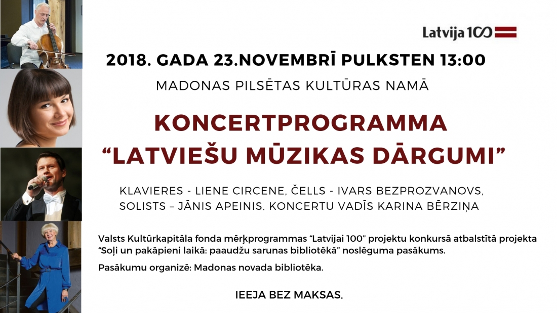 Klavieres - Liene Circene, čells - Ivars Bezprozvanovs, solists – Jānis Apeinis. Koncertu vadīs Karina Bērziņa