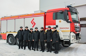 Foto no kreisās: ugunsdzēsējs glābējs Andris Lazdups, vada komandieris Vasilijs Trusovs, nodaļas komandieris Normunds Briežkalns, daļas komandieris Māris Bulders, vada komandiera vietnieks Normunds Arama, ugunsdzēsējs glābējs (autovadītājs) Dzintars Zaretoks un ugunsdzēsējs glābējs Guntis Āre.