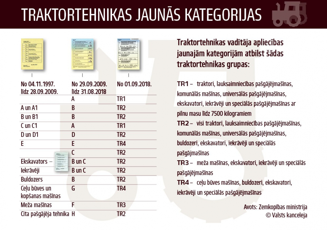 Tāpat VTUA atgādina, ka kopš 2018.gada septembra tiek mainīta vecā parauga traktortehnikas vadītāja apliecība, pat, ja derīguma termiņš vēl nav beidzies, pret jauno kategoriju bez papildu eksāmenu veikšanas. Jaunā traktortehnikas vadītāja apliecība paplašina traktortehnikas kategoriju grupas - persona ir tiesīga vadīt plašāku traktortehnikas klāstu nekā tas ir paredzēts vecā parauga apliecībā.