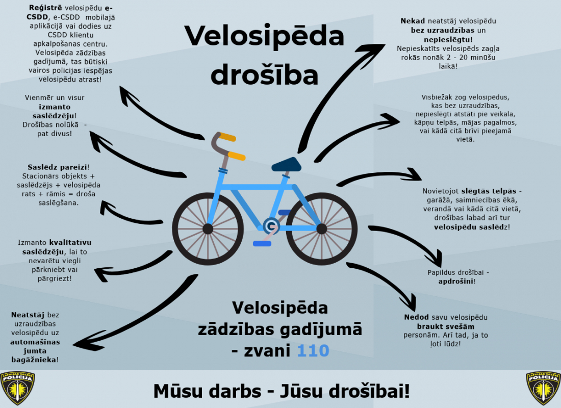 Reģistrē! Pērkot jaunu velosipēdu, uzreiz pēc iegādes, reģistrējiet to Ceļu satiksmes drošības direkcijas mājas lapā e.csdd.lv, e-CSDD mobilajā aplikācijā vai klientu apkalpošanas centros. Tas ir nepieciešams, lai velosipēda zādzības gadījumā policijai būtu meklēšanai nepieciešamā informācija, kā arī, atrodot zagtu velosipēdu, varētu noskaidrot tā likumīgo īpašnieku. Pirms lietota velosipēda iegādes, veiciet rāmja numura pārbaudi CSDD mājas lapā, lai noskaidrotu, vai jūsu noskatītais nav reģistrēts kā nozagts velosipēds.