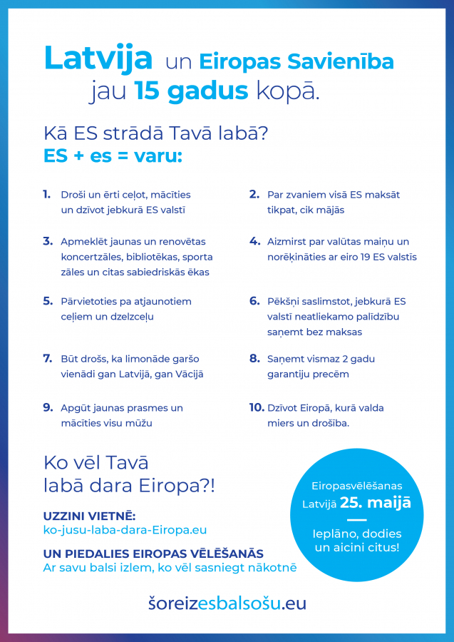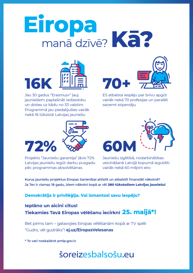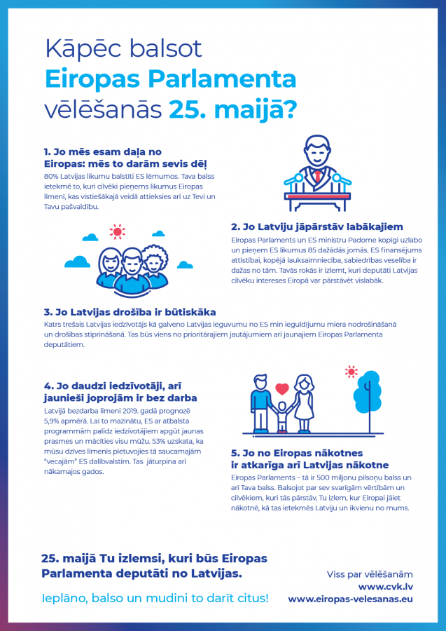 Nākamās Eiropas Parlamenta jeb Eiropas vēlēšanas Latvijā notiks sestdien, 2019. gada 25. maijā. Ikviens ir aicināts piedalīties un nobalsot!