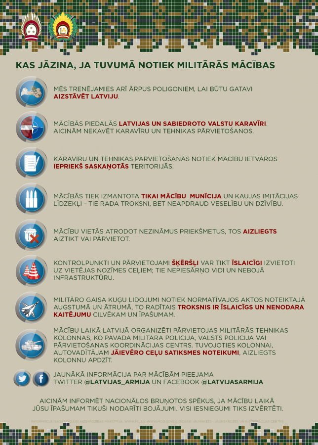 Iedzīvotāji tiek aicināti neuztraukties, redzot arī karavīru un zemessargu pārvietošanos ārpus militārajiem poligoniem un vienību izvietojumiem, tehnikas un cita veida aprīkojuma izvēršanu un pozīciju ieņemšanu dažādās Latvijas vietās.