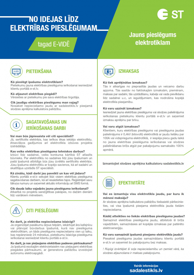 Atkarībā no projekta sarežģītības pakāpes, jauna elektrības pieslēguma ierīkošana vai slodzes palielināšana var aizņemt no dažām dienām līdz vairākiem mēnešiem. Klientu portālā e-st.lv sekojiet līdzi visiem elektrības pieslēguma sagatavošanas darbiem, kā arī iesaistieties tajos. Reģistrējiet savu tālruņa numuru un saņemiet aktuālo informāciju arī SMS formā.