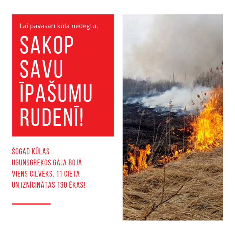 Lai pasargātu sevi un savu īpašumu, kā arī mazinātu kūlas ugunsgrēku skaitu, Valsts ugunsdzēsības un glābšanas dienests (VUGD) aicina iedzīvotājus un pašvaldības savlaicīgi sakopt sev piederošās teritorijas jau rudenī, lai pavasarī nebūtu kūlas, kam degt!