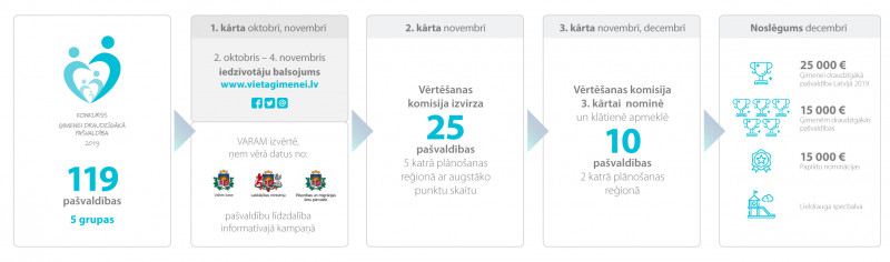 Konkurss “Ģimenei draudzīgākā pašvaldība” norisinās jau trešo gadu, un tā mērķis ir izcelt labākos piemērus un risinājumus, kā pašvaldības rūpējas par ģimenēm. Tīmekļvietnē www.vietagimenei.lv ikviens var iepazīties ar pašvaldību sniegto informāciju par to daudzveidīgajām iespējām, piedāvājumiem un atbalstu ģimenēm ar bērniem.