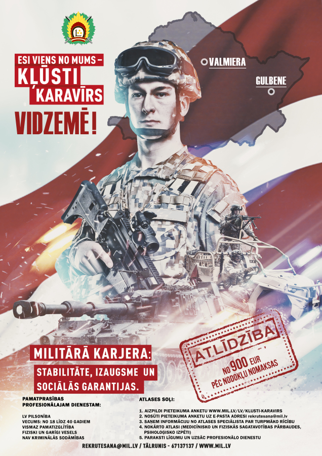 uzziņām:67137137/rekrutesana@mil.lv vai 26317364 Zemessardzes 25.kājnieku