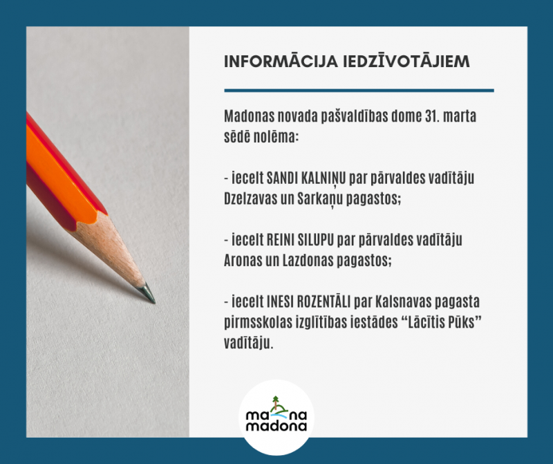 Domes 31. marta sēdē tika arī pieņemts lēmums iecelt Inesi Rozentāli par Kalsnavas pagasta pirmsskolas izglītības iestādes “Lācītis Pūks” vadītāju.