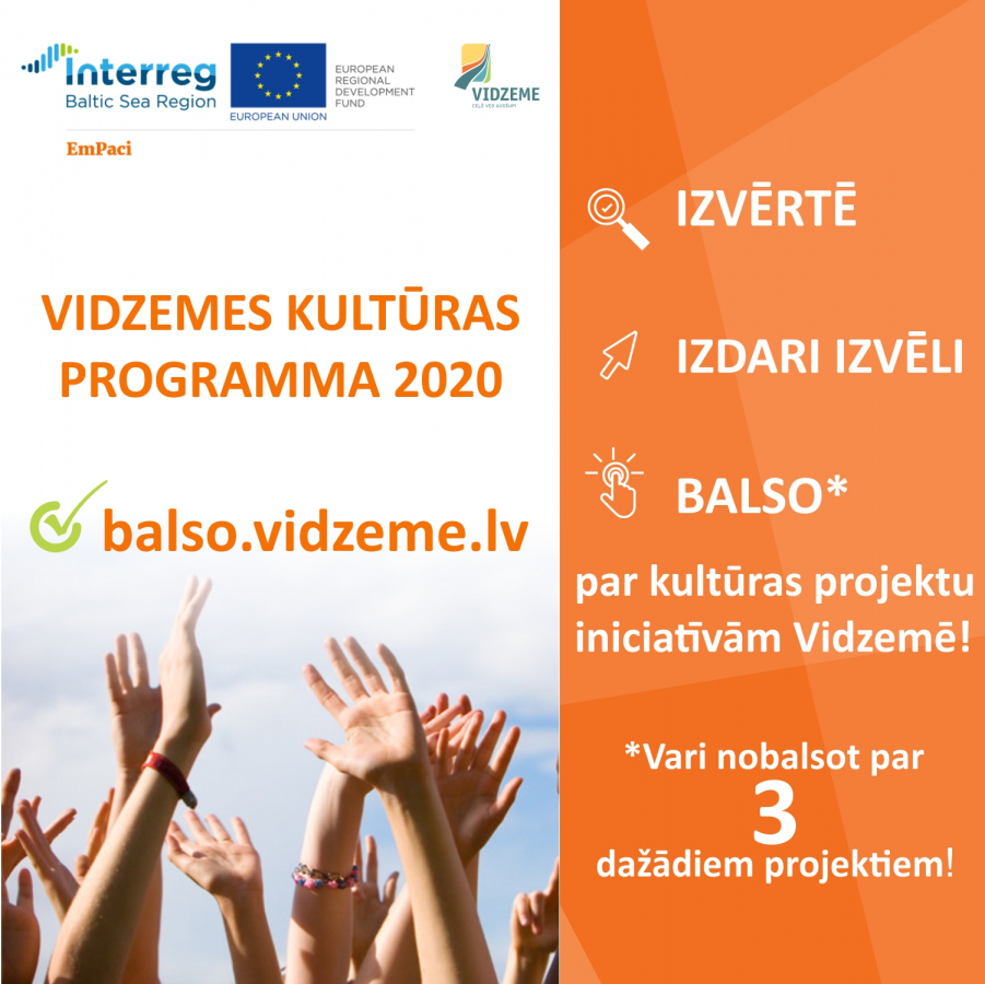 Ikviens vidzemnieks līdz 23. aprīlim var paust atbalstu, nobalsojot par pieteikumiem, kas iesniegti konkursam “Vidzemes kultūras programma 2020”. Ar rezultātiem tiks iepazīstināta programmas ekspertu komisija un lēmumu par projektu atbilstību programmai, kā arī finansējuma piešķiršanu, pieņems Valsts kultūrkapitāla fonds saskaņā ar ekspertu komisijas sagatavoto ieteikumu.