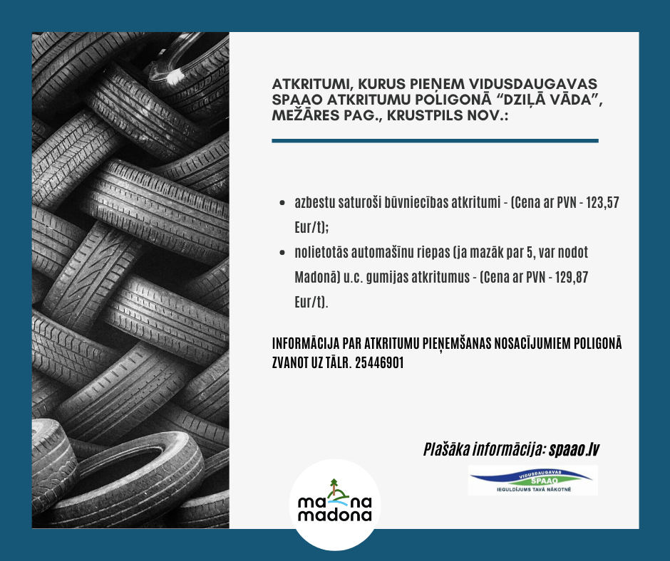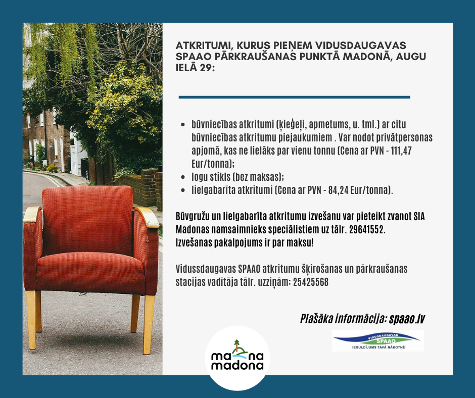 Jāatgādina, ka sašķirotos atkritumus iespējams nogādāt SIA “Madonas namsaimnieks”, Augu ielā 29, kur atrodas četri konteineri blakus nolietoto elektropreču konteineriem. Viens no tiem ir paredzēts stiklam, trīs - papīram, plastmasai un metāla iepakojumam. Pārējos, nešķirojamos atkritumus, jāievieto sadzīves atkritumu konteineros. Liela apjoma atkritumus (lielgabarīta) iespējams nodot Vidusdaugavas SPAAO, Madonā, Augu ielā 29, kur atkritumi tiek nosvērti un par tiem jāsamaksā pēc fakta (84,24 eur/tonna).