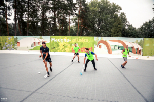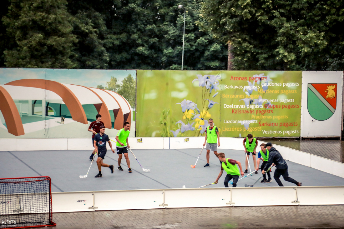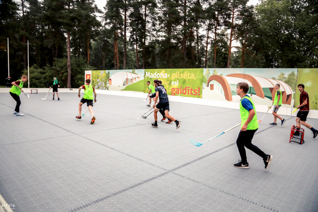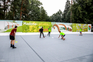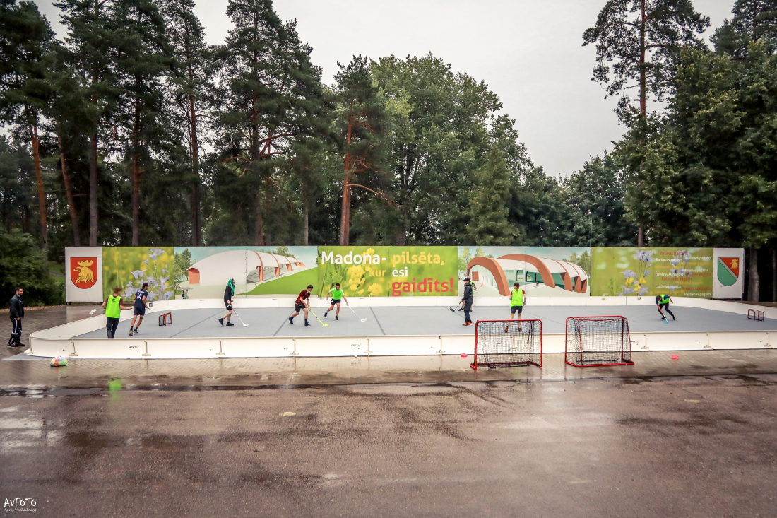 Spītējot lietum, FK “Madona” florbolisti jauno mākslīgo segumu iemēģināja jau vakar, 5. augustā, taču oficiāla laukuma atklāšana plānota 29. augustā - FIS Pasaules kausa rollerslēpošanā ietvaros.