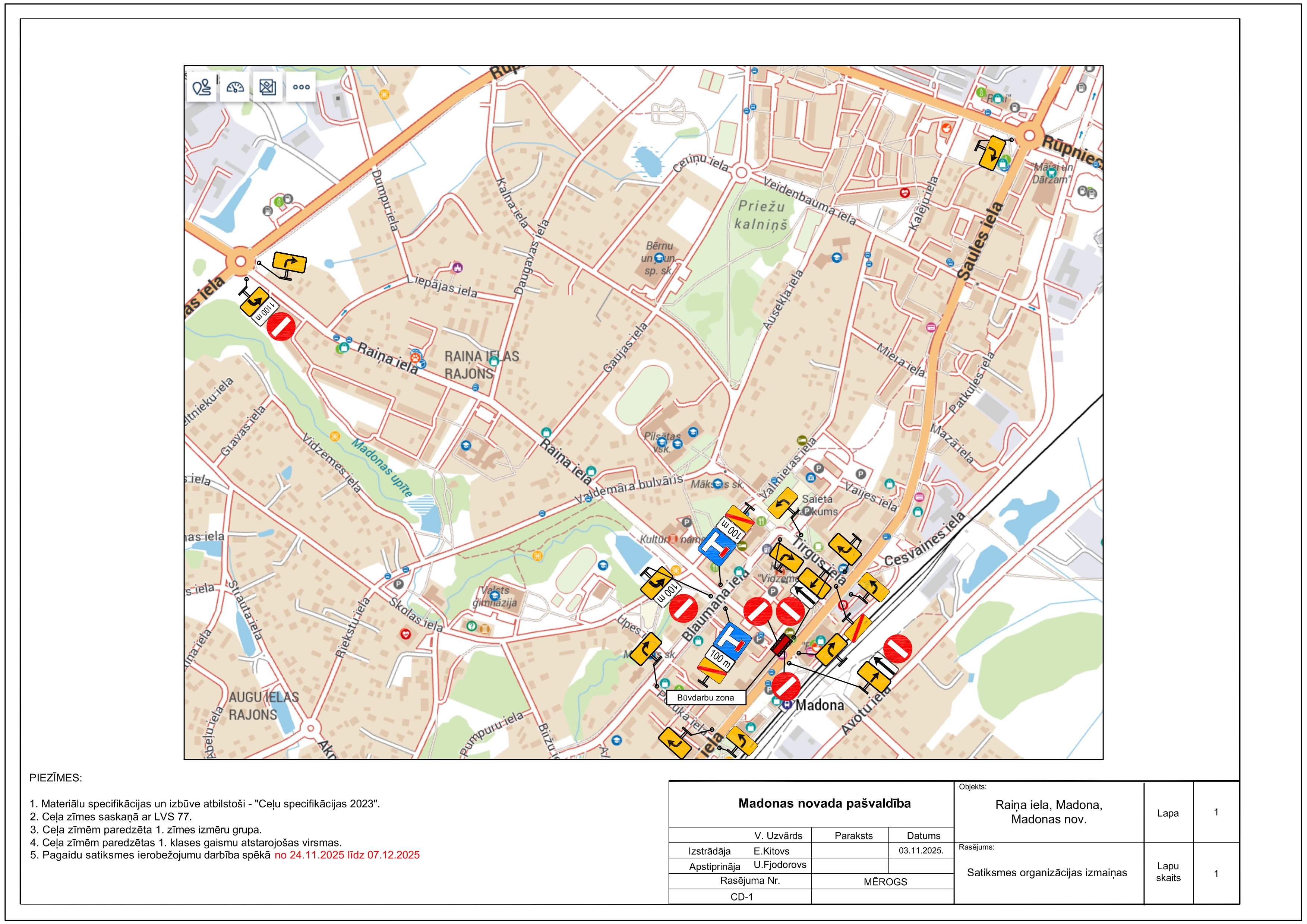 Minētajā laika posmā tiks slēgta satiksme Raiņa ielā, Madonā, 20 m garā posmā no krustojuma ar Saules ielu, līdz iebrauktuvei privātīpašuma stāvlaukumā ar adresi Saules iela 15.