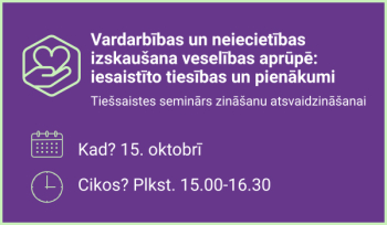 Tiesībsardze Karina Palkova aicina ārstniecības atbalsta un sociālās aprūpes personālu uz semināru par vardarbības un neiecietības izskaušanu veselības aprūpē, skaidrojot iesaistīto tiesības un pienākumus. Bezmaksas tiešsaistes seminārs notiks 15.10.2025. plkst.15.00-16.30.