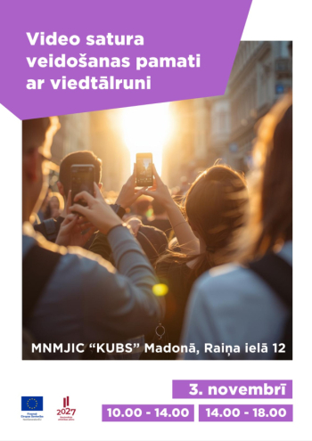Projekta “Digitālā darba ar jaunatni sistēmas attīstība pašvaldībās”, Nr. 2.3.2.1.i.0/1/23/I/CFLA/002 ietvaros 03.11.2025. plkst. 10:00 un 14:00 Madonas multifunkcionālajā iniciatīvu centrā “Kubs” un 05.11.2025. plkst. 10:00 Lubānas multifunkcionālajā centrā notiks nodarbība "Video veidošana satura veidošanas pamati ar viedtālruni”.