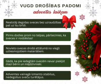 Svētdien sagaidīsim Pirmo Adventi, kad mājokļos tiek iedegtas sveces un novietoti adventes vainagi. Šie rotājumi rada svētku noskaņas un siltuma sajūtu, bet var arī kļūt par ugunsgrēka izcelšanās iemeslu. Sagaidot adventes laiku, Valsts ugunsdzēsības un glābšanas dienests (VUGD) atgādina drošības padomus, lai svētki būtu droši un priecīgi.