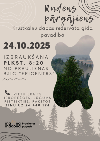 Aicinām pievienoties aizraujošam pārgājienam Krustkalnu dabas rezervātā! Pārgājiena laikā dalībnieki gida vadībā iepazīs vienu no Latvijas īpaši aizsargājamām teritorijām, kur sastopami plaši mežu masīvi, mitrāji un retas augu un dzīvnieku sugas.