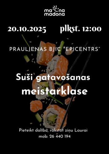 2025. gada 20. oktobrī plkst. 12:00 Praulienas BJIC “Epicentrs” aicinām uz gardu un aizraujošu meistarklasi, kurā kopā gatavosim suši un suši burgerus!