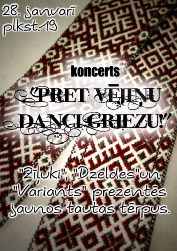 28. janvārī plkst. 19 Dzelzavas kultūras namā notiks koncerts "Pret vējiņu danci griezu", kurā kultūras nama kolektīvi "Dzeldes', "Variants"un "Zīļuki" prezentēs savus jaunos tautas tērpus. Viesosies cesvaines jauniešu deju kolektīvs "Sprīdītis".