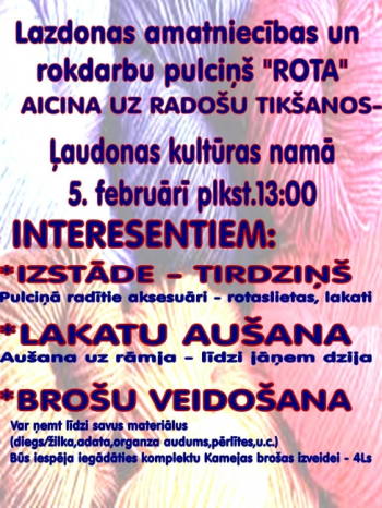 Ļaudonas kultūras namā 5. febrārī plkst. 13:00 viesosies amatniecības un rokdarbu pulciņa "Rota" dalībnieces Natālija un Vanda, lai interesentiem iemācītu veidot dažādus sievišķīgus aksesuārus! (iespēja gan ņemt materiālus līdzi, gan iegādāties uz vietas)